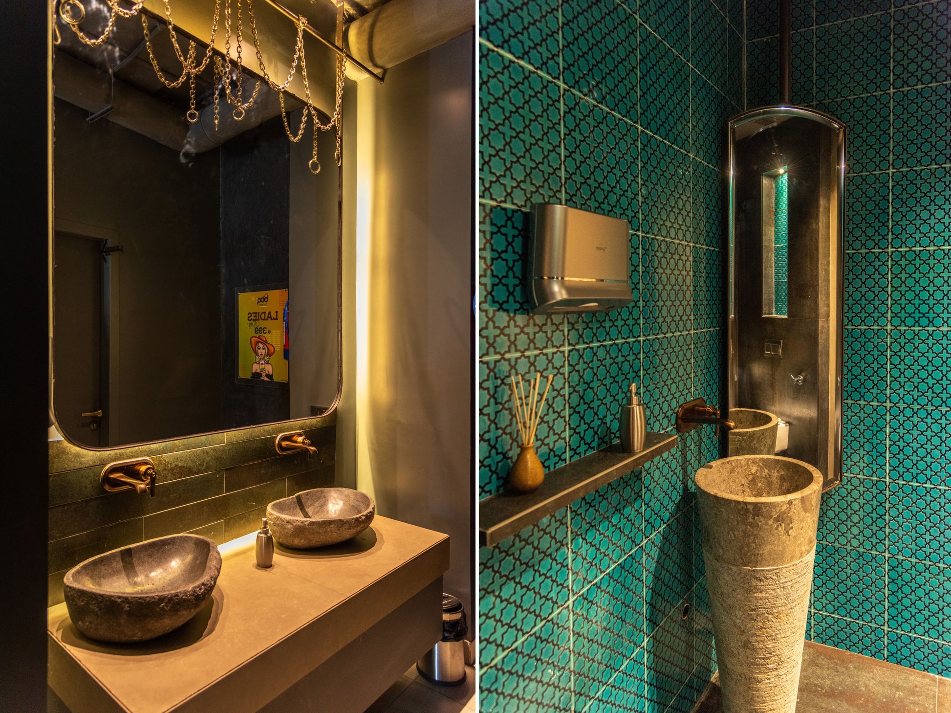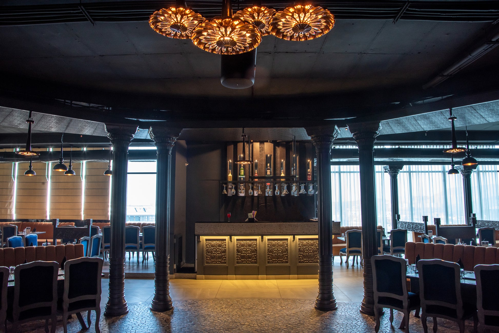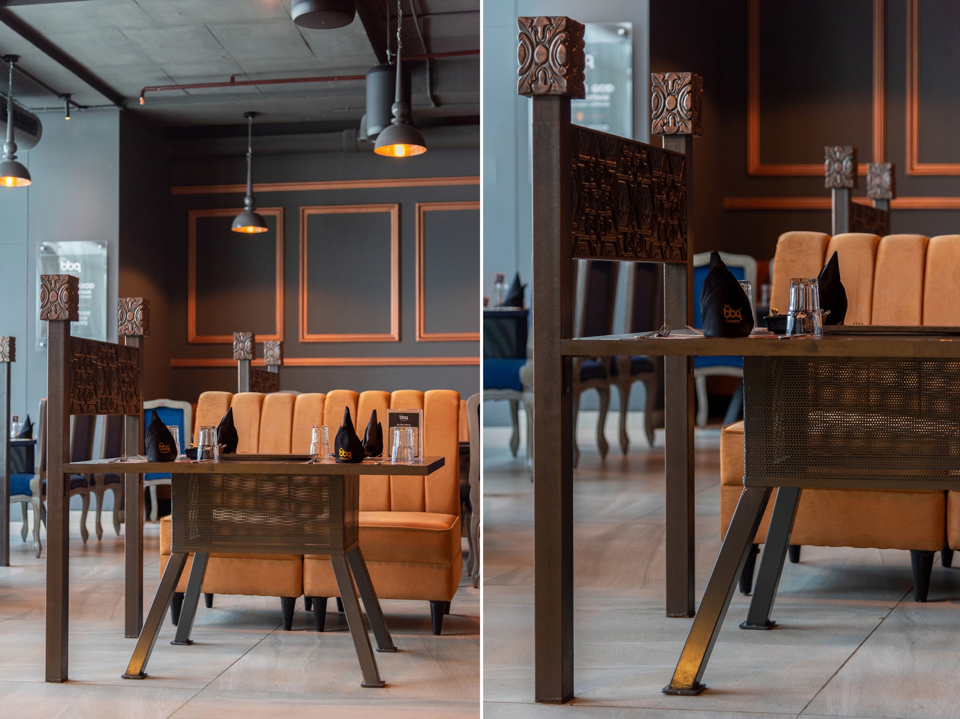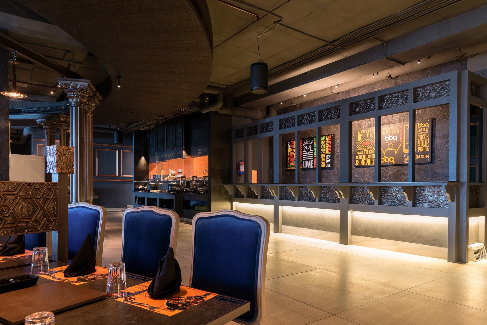 The restaurant's vibrant design features deep blue, chrome yellow, and rustic brown tones, complemented by embossed metal partitions and art deco accents. Metal hanging lamps provide elegant lighting, while European columns and intricate carvings add sophistication. The design aims to bedazzle patrons with its unique elements. The layout is thoughtfully optimized for space and flow, ensuring a comfortable and visually appealing dining experience.